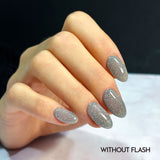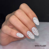 The brighter the light, the brighter the sparkle. Can be layered up for full covered or applied over a base coat. Please see hand images for the full effect.