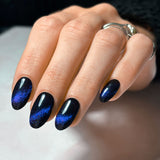 A blue magnetic / cat-eye gel that comes alive when magnetised. Watch it shine in the light transforming to a purple/violet/golden glow.