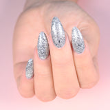 A mixed fine & medium silver glitter gel. Great to use as a glitter topper gel or layered for full coverage.