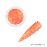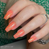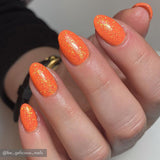 A fine, bright orange glitter with a yellow sparkle. For best results and full coverage, layer over a complementary base colour.