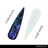 Create nails that are out of this world with the Interstellar Chameleon Chrome Flakes! Best applied over a dark base for a stand out effect, these flakes look different over any colour, so you will be sure to have fun experimenting to create different looks!