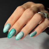 A magnetic bold green and silver fine sparkle gel that transforms to a stunning velvet effect when magnetised. For an emerald green, apply one coat over a black base. Can also be used without a magnet for a super sparkly mani.