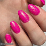 A fine, pale pink iridescent glitter with a light golden sparkle. For best results and full coverage, layer over a complementary base colour.